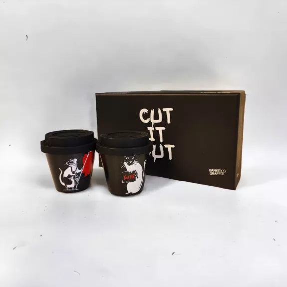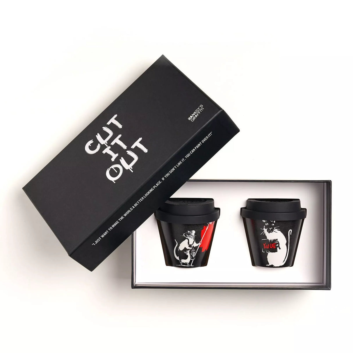 De exclusieve geschenkdoos bevat 2 Banksy's Graffiti espresso kopjes "rat" lijn, gemaakt van R-pet, food-grade gerecycled plastic; het hele assortiment is bedacht, gedefinieerd en ontworpen in Italië.