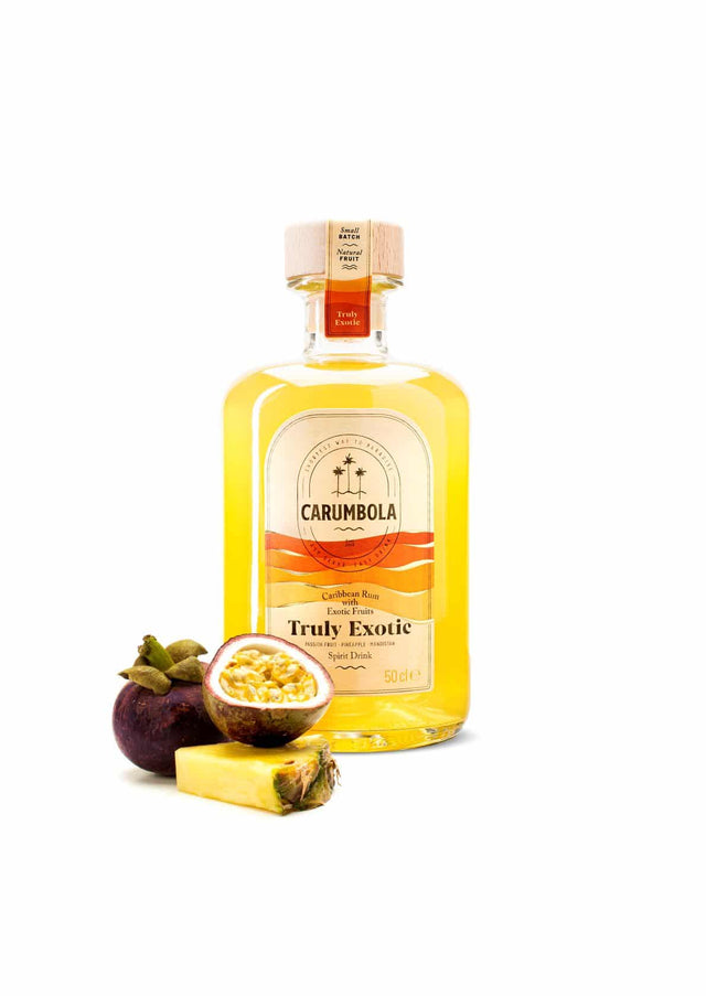 CARUMBOLA Truly Exotic is een premium Caribbean rum met natuurlijke sappen van exotische vruchten – ananas, passievrucht en mangosteen.