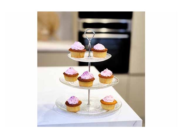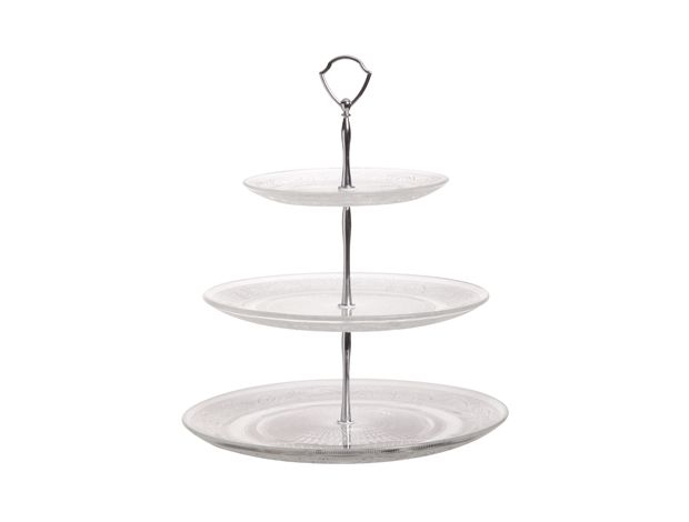 De etagère heeft een uitgesproken vintage look dankzij de sierlijke motieven aan de onderkant van de glazen plateaus. Bovendien is de etagère voorzien van een ringetje zodat hij ook erg gemakkelijk en veilig te verplaatsen is.