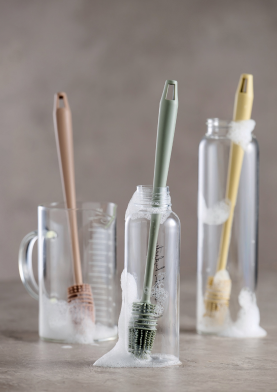 Met deze siliconen flessenborstel maak je makkelijk alle flessen en drinkbekers van binnen schoon. Extra handig: het is hittebestendig.