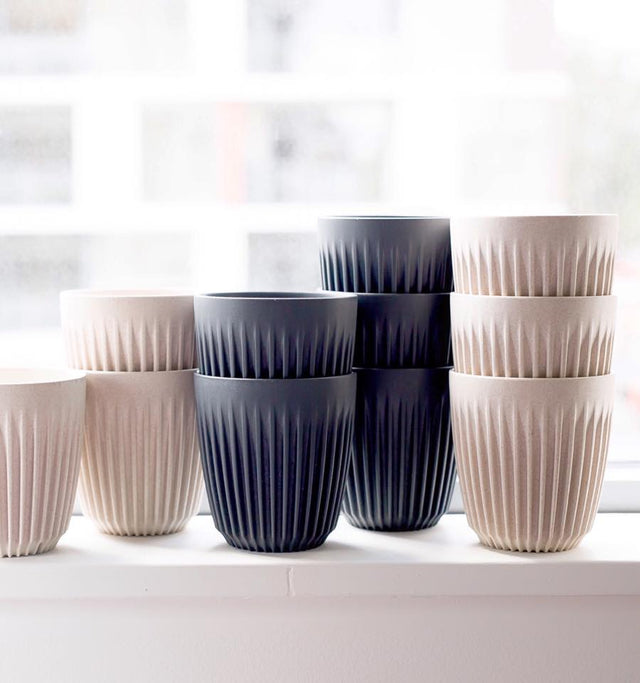 De koffiebeker is gemaakt van de schillen van koffie en is een organisch materiaal dat overblijft bij de verwerking van de koffiebonen. Dus dat is mooi gerecycleerd!