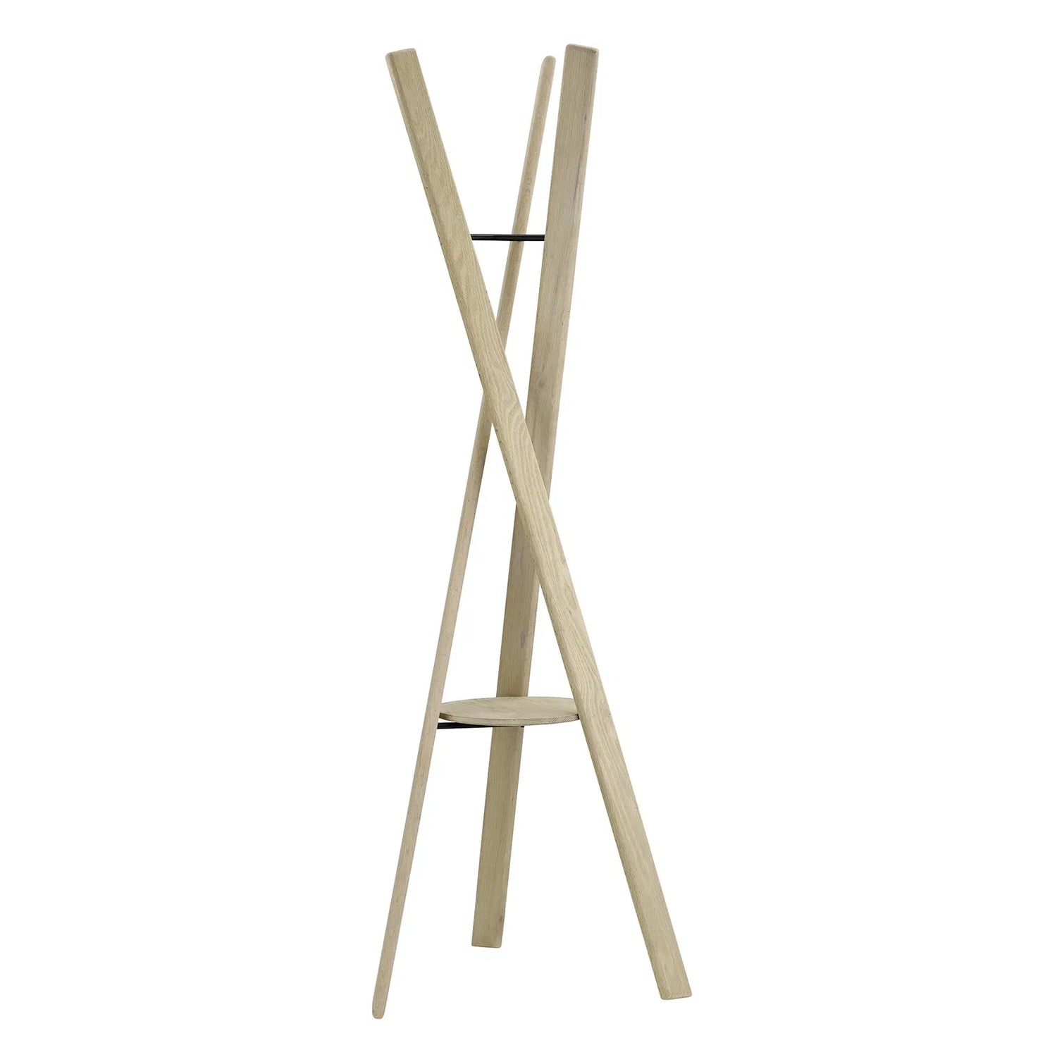 Ondanks het minimalistische ontwerp staat de functionaliteit van deze kapstok geenszins op de achtergrond. Sleutels of tassen kunnen op een rond plateau worden geplaatst. De drie houten elementen bieden ruimte voor jassen, sjaals en hoeden, en aan de metalen verbindingen kunnen naar behoefte hangers worden bevestigd.
