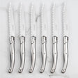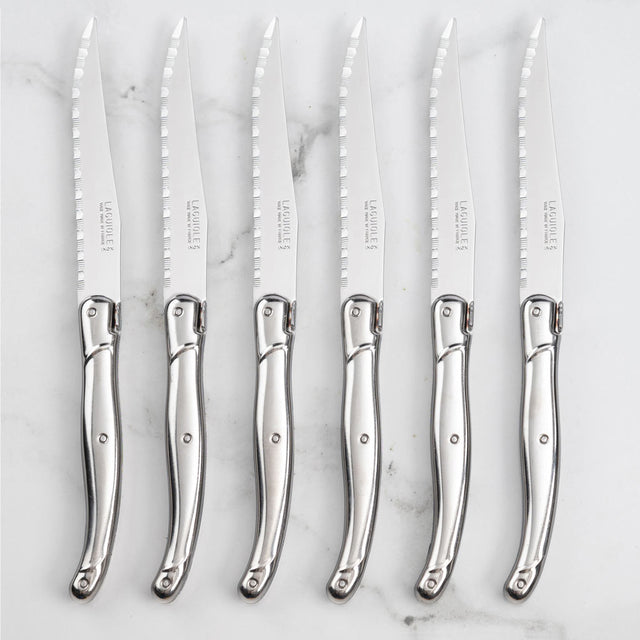 Laguiole steakmessenset in handige lademessenblok. Deze basisversie van het beroemde Laguiole steakmes is uitgevoerd in gehard roestvrij staal met een staaldikte van 1,2 mm. Het mes heeft een gekarteld lemmet. Het roestvrijstalen heft is met inox klinknagels stevig bevestigd aan de doorlopende angel. De snede met micro-denture blijft lang scherp en is perfect voor het snijden van vlees en pizza.