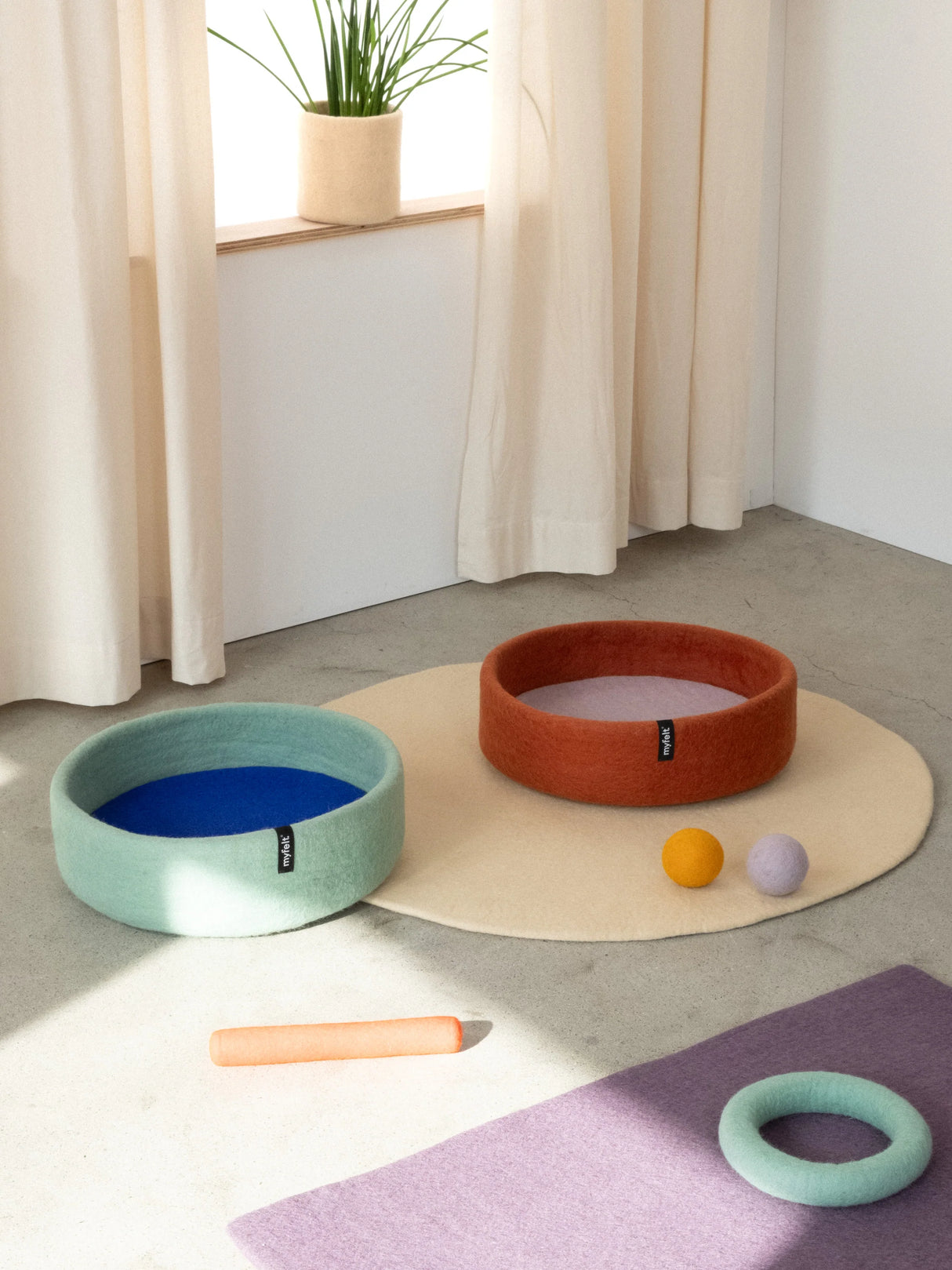 Wolvilt is een robuust, onderhoudsvriendelijk en duurzaam materiaal. Het natuurlijke vetgehalte en de hoge dichtheid voorkomen een snelle penetratie van de bescherming. myfelt Producten mogen alleen droog en zonder borstelopzetstukken worden schoongemaakt. Vloeistoffen kunnen eenvoudig worden verwijderd met een vochtige doek of spons.