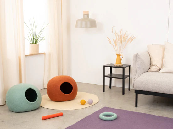 In de grot, handgemaakt van zuiver scheerwol, voelen grote en kleine katten zich prettig en veilig. Het duurzame materiaal is onderhoudsvriendelijk, hygiënisch en antibacterieel dankzij het natuurlijke wolvet. Wolvilt heeft antistatische eigenschappen en is temperatuurregulerend. De vilten grot is warm en behaaglijk in de winter en aangenaam koel in de zomer.
