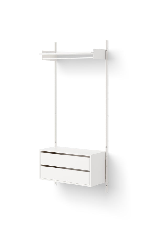 - Onderdelen: 1 x NW Wandstang, 1900 (set van 2), 1 x NW Diepe plank, 1 x NW Garderobekasthouder, 1 x NW Lage kast met laden en 1 x NW Kasthouder.