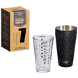 Bevat een maatbeker in glas en shaker in metaal.