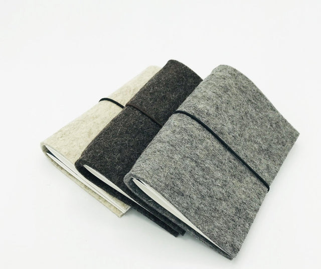 Mooi, minimalistische notebook met een zachte cover van vilt en 2 notaboekjes A6 met grafische illustratie.