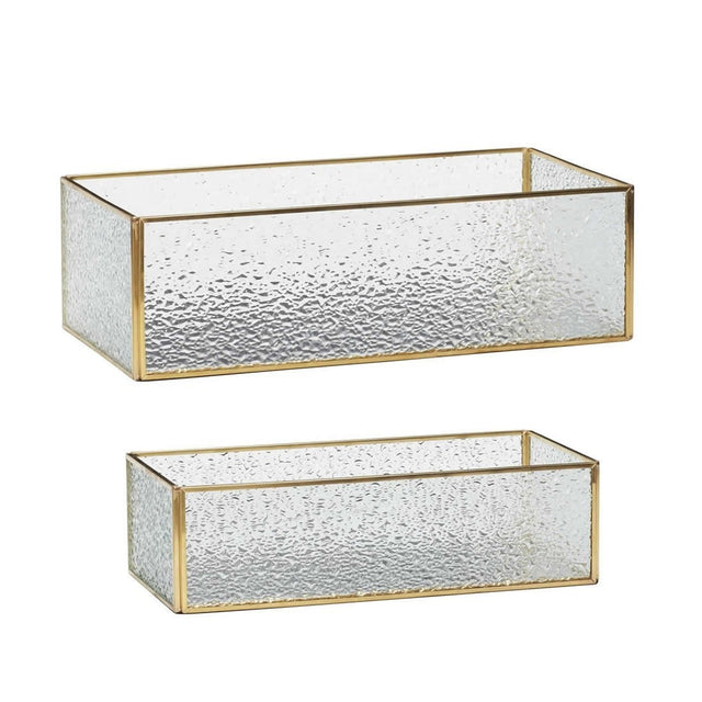 Stijlvolle sierdozen van glas met messing frame, gemaakt door Hübsch Interior. Het glas is bewerkt waardoor het semi-transparant is. Een mooie manier om je kostbare sieraden op te bergen bijvoorbeeld!