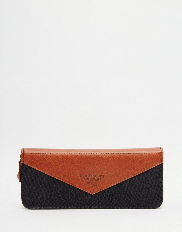 Een beetje self-made-man gaat nooit zonder hulpmiddelen op pad. Deze slimme grijze gewaxt canvas etui met rits bevat twee potloden, een slijper en een gum (in het zeldzame geval van een fout).