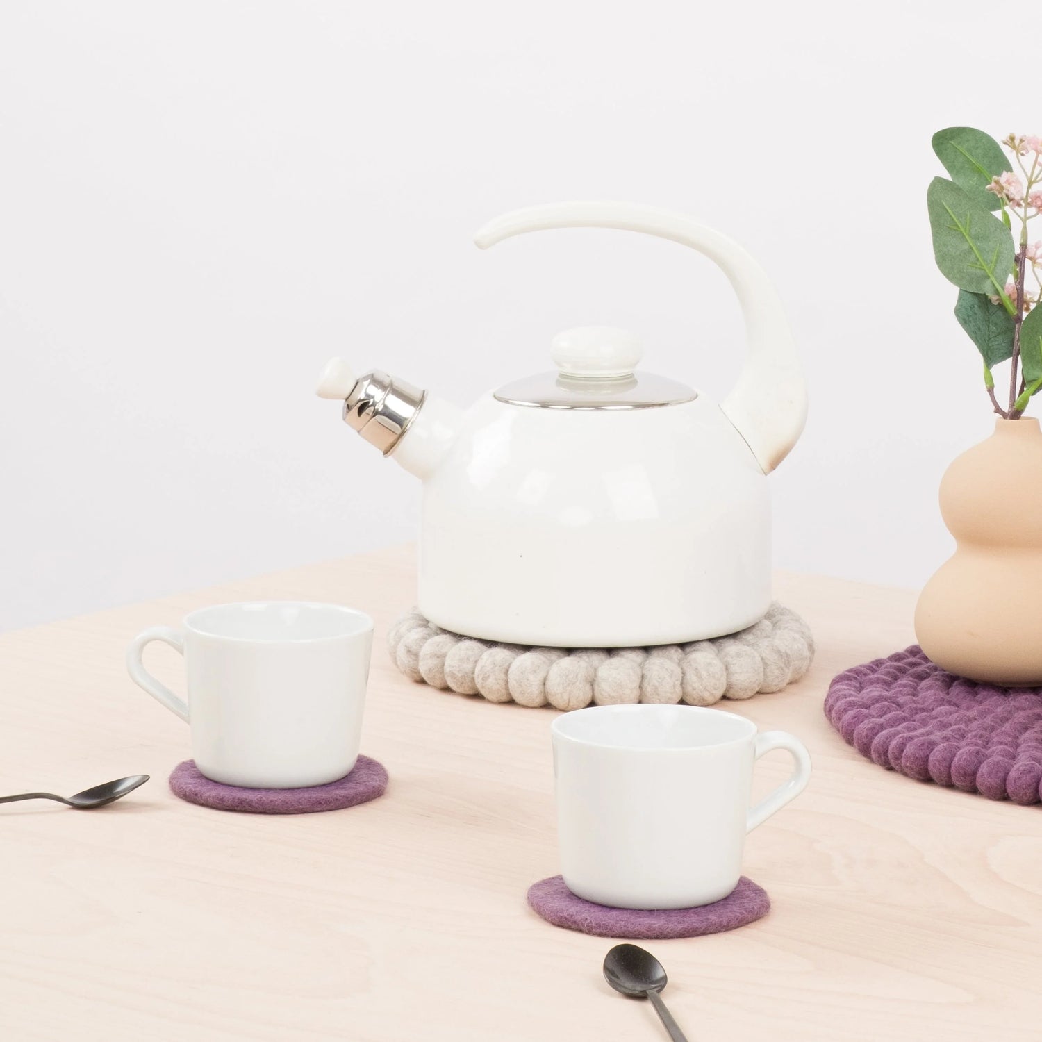 De ronde potonderzetter BELA (20 cm) van zuiver scheerwol beschermt niet alleen gevoelige oppervlakken, maar zorgt dankzij het klassieke design ook voor een elegante en tijdloze uitstraling.