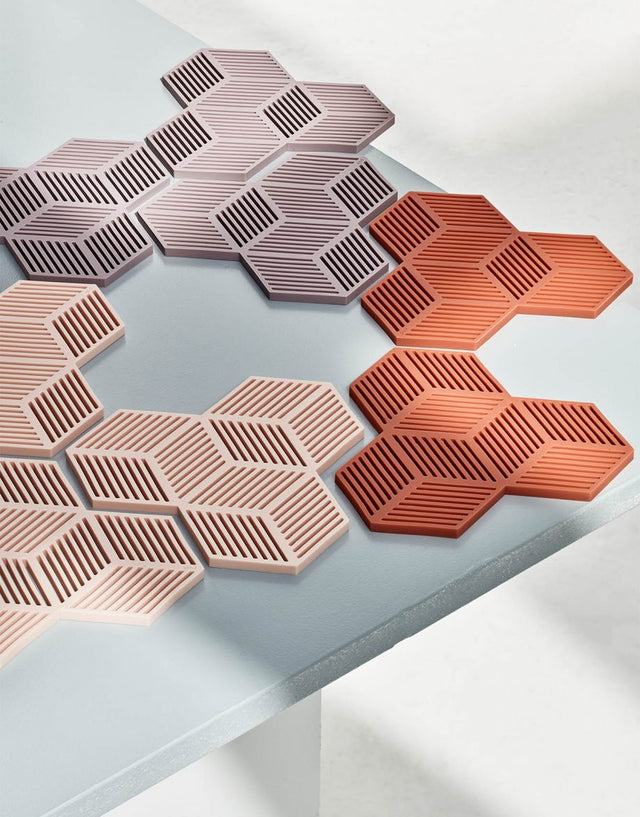 Onze Sico onderzetters maken van elke drank het beste. Ontworpen door Cecilia Valentine, grijpen deze onderzetters in elkaar om een groot oppervlak te bedekken en tegelijkertijd een speels, geometrisch patroon te creëren.