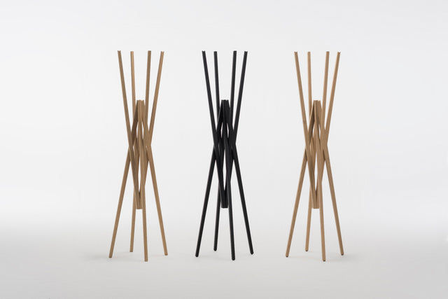 De houten kapstok is beschikbaar in eik (natuur, licht of zwart)