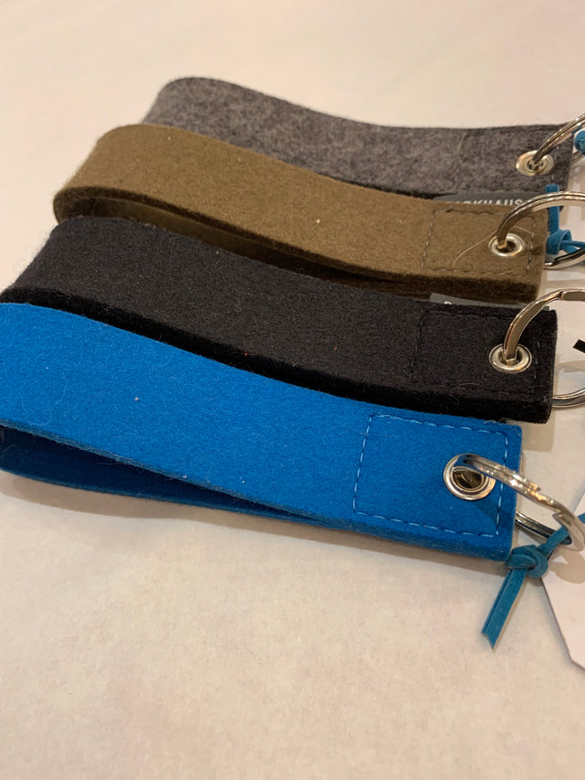 De sleutelhanger is beschikbaar in het donkergrijs, mosgroen, zwart, en blauw.