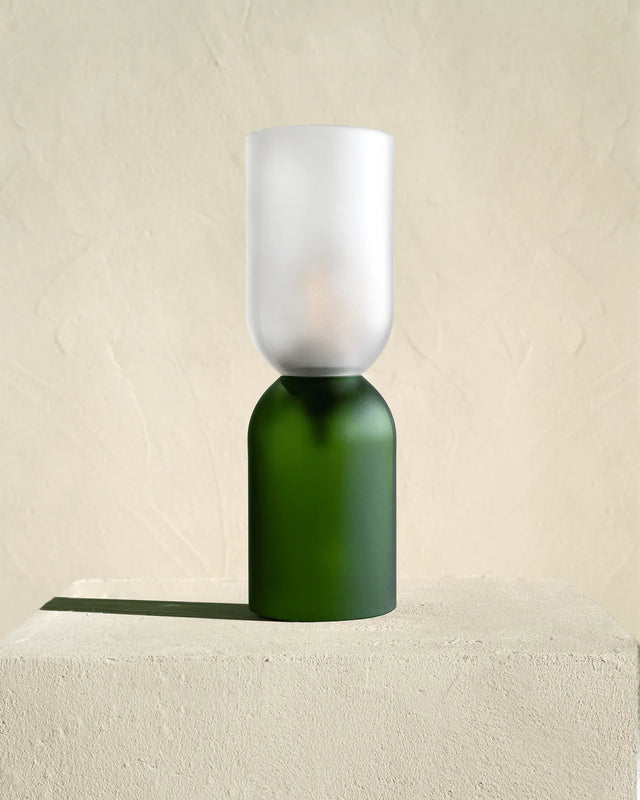 Onder zijn ogenschijnlijke eenvoud ontstaat deze eerste ambachtelijke editie uit precieze gebaren. Er zijn vele productiestappen nodig om deze eerste collectie tafellampen te creëren: Elke lamp wordt gevormd uit gerecyclede wijnmagnums en vervolgens met de hand in elkaar gezet in onze werkplaats aan de Opaalkust. Uit deze transformatie ontstaat een zandlopervorm, het resultaat van de delicate combinatie van twee glazen klokken met contrasterende tinten. De klokken worden van buitenaf gezandstraald om een warm en zacht licht te verspreiden en worden vervolgens in de oven geoven voor een satijnachtige afwerking. Het resultaat: een uniek stuk dat de transparantie en het materiaal van gerecycled glas sublimeert.