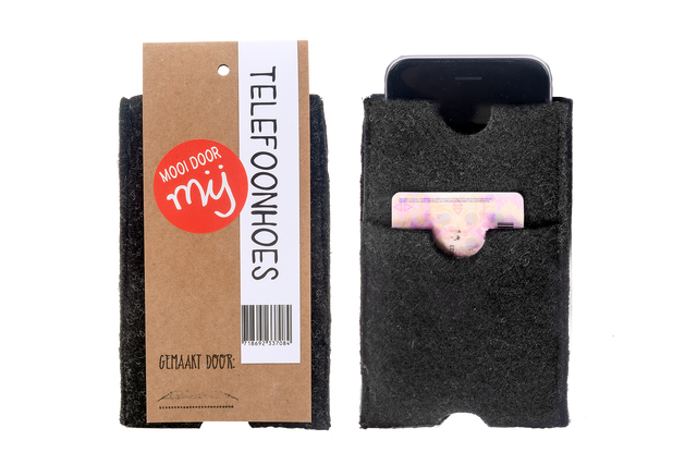 Dit vilten telefoonhoesje is geschikt voor twee telefoons of voor één mobiel en overige pasjes en belangrijke spullen.