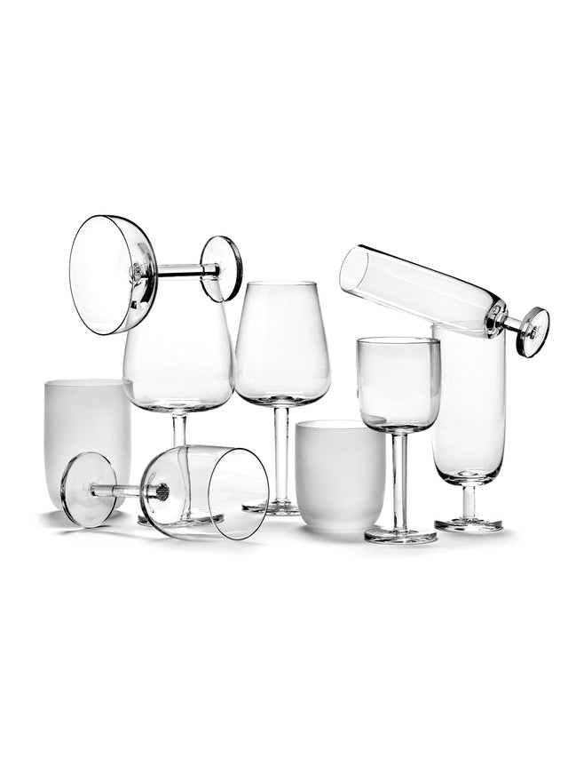De 9 verschillende glazen van de Base Glaswerk-collectie volgen de trend van de Base-lijn van Studio Piet Boon voor Serax. De 2 waterglazen kregen een gezandstraald effect.