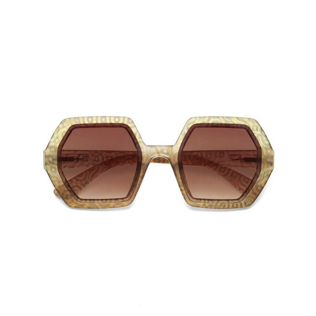 EMMA is een voorgemonteerde zeshoekige zonnebril met zacht aanvoelend frame en overlappende lenzen.