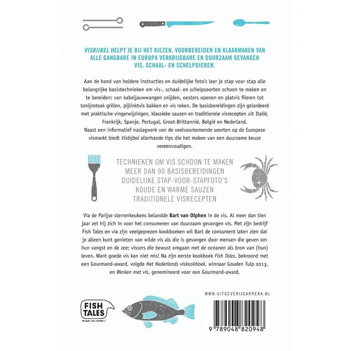 Visbijbel helpt je bij het kiezen, voorbereiden en klaarmaken van alle gangbare in Europa verkrijgbare en duurzaam gevangen vis, schaal- en schelpdieren. Aan de hand van heldere instructies en duidelijke foto's leer je stap voor stap alle belangrijke basistechnieken om vis-, schaal- en schelpsoorten schoon te maken en te bereiden: van kabeljauwwangen snijden, oesters openen en platvis fileren tot tonijnsteak grillen, pijlinktvis bakken en vis roken. De basisbereidingen zijn gelardeerd met praktische vingerwijzingen, klassieke sauzen en traditionele visrecepten uit Italië, Frankrijk, Spanje, Portugal, Groot-Brittannië, België en Nederland.