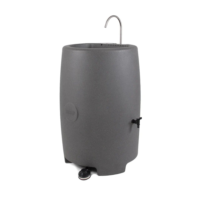 De Raintap tovert een regenton om in een veelzijdig buitenwaterstation. De kraan (en eventuele freshwatertap), voetpomp en spoelbak maken het tot een slim waterstation en verandert het van regenton, naar (hand)wasplaats, naar een compacte buitenkeuken.