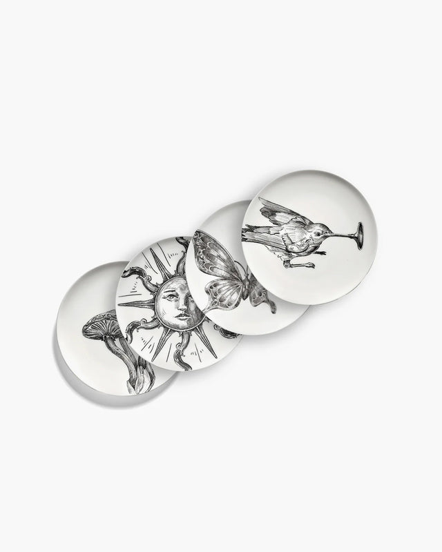 Deze set van vier porseleinen broodbordjes uit de Unity-collectie bevat vier verschillende motieven: Hummingbird, Butterfly, Sun en Mushrooms. Elke illustratie werd handgetekend door het creatieve team van Tomorrowland en weerspiegelt de magische beeldtaal van het festival. Gemaakt van hoogwaardig wit porselein, gekozen om zijn tijdloze elegantie.