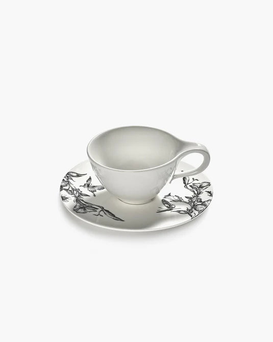 Deze porseleinen theekop uit de Unity-collectie combineert een minimalistisch ontwerp met een handgetekende illustratie van het creatieve team van Tomorrowland.
