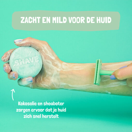 - Wrijf de Shaving Bar tussen je natte handen (of direct op de natte huid) om deze te laten schuimen. Verdeel het zachte schuim daarna over je huid