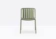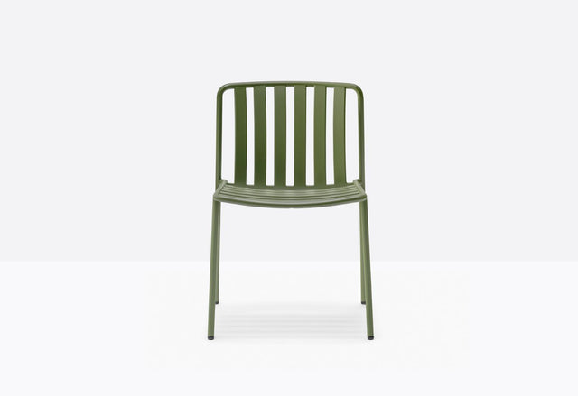 Een mono-materiaal stoel gemaakt van gebogen en sterk buisvormig frame. De zitting en rugleuning creëren een driedimensionale ondersteuning, die zorgt voor structurele stevigheid en ergonomie. De gelijk verdeelde verticale latten van de rugleuning, gegoten en gevormd uit metaalplaat, creëren een onderscheidend patroon samen met de horizontale van de zitting.