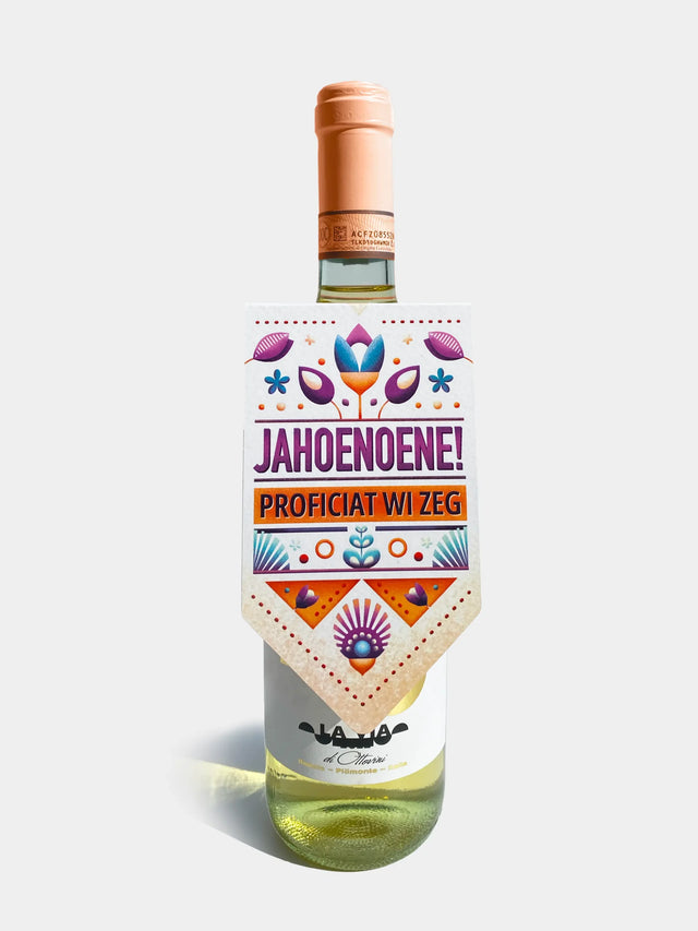 Op zoek naar een originele manier om iemand te feliciteren? Met deze West-Vlaamse drankhanger zeg je op z’n sappigst: “Jahoenoene, proficiat wi zeg!”Een fles drank cadeau doen was nog nooit zo plezant!