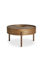 Het wiskunde concept is terug te vinden in het tafelblad van deze salontafel. Zo bestaat het tafelblad uit twee halve cirkels die samen één vormen. Het bovenste tafelblad is draaibaar en verhult een handig opbergvak. Je kunt ervoor kiezen het vak open te laten staan maar je kunt het ook sluiten om spullen te verbergen.