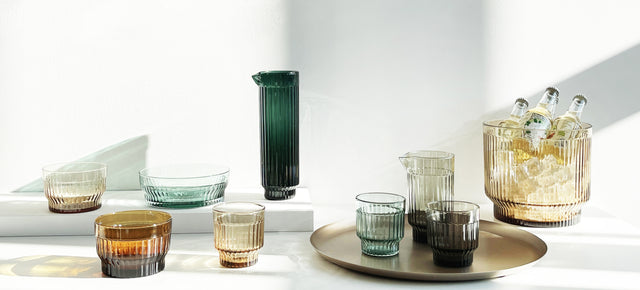 De stapelbare Lima bekers met bijpassende karaffen en kommen zijn vakkundig met de mond geblazen. Elk stuk is lichtjes verschillend van het andere, omdat elk stuk met de hand gemaakt is.