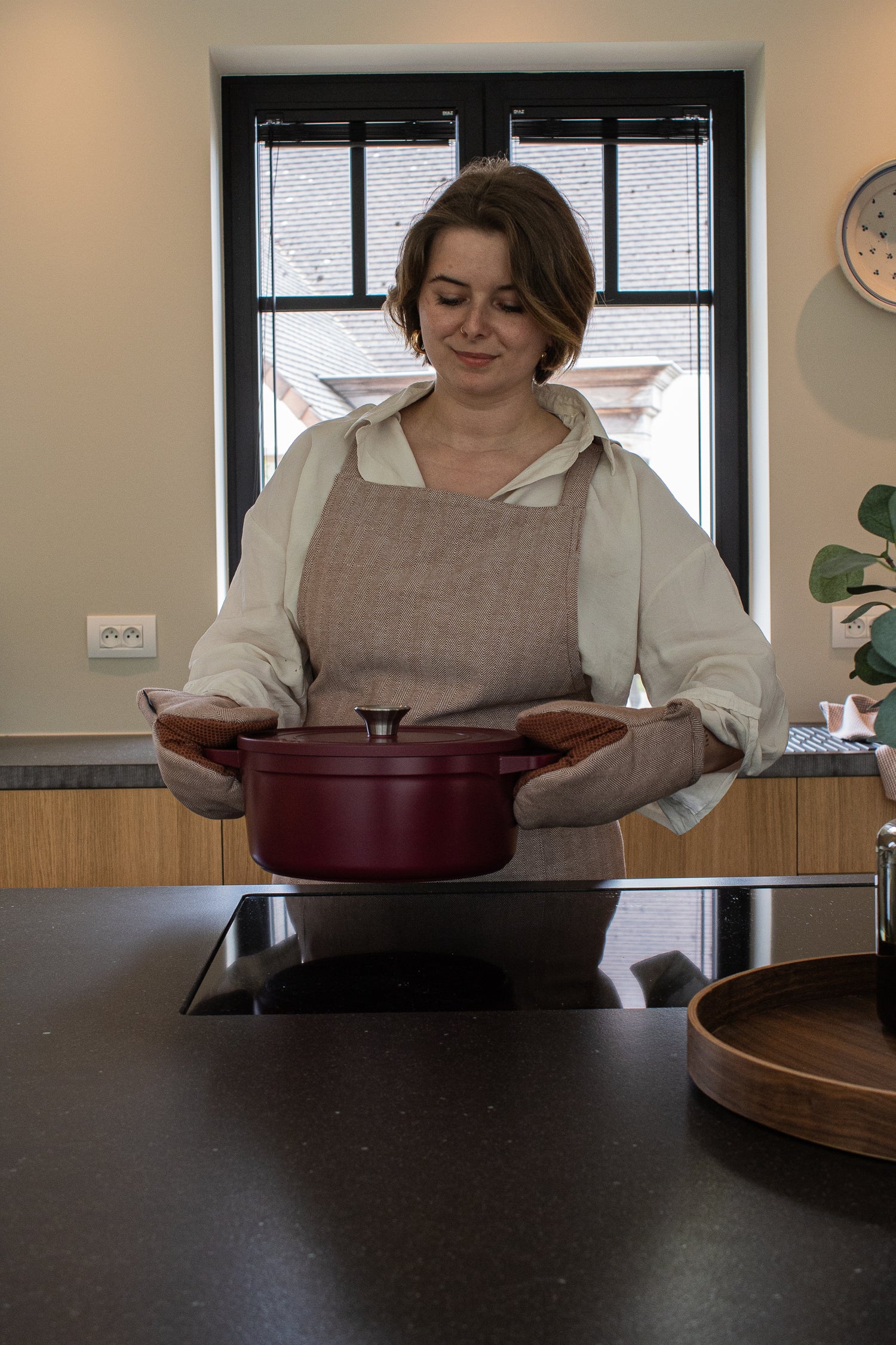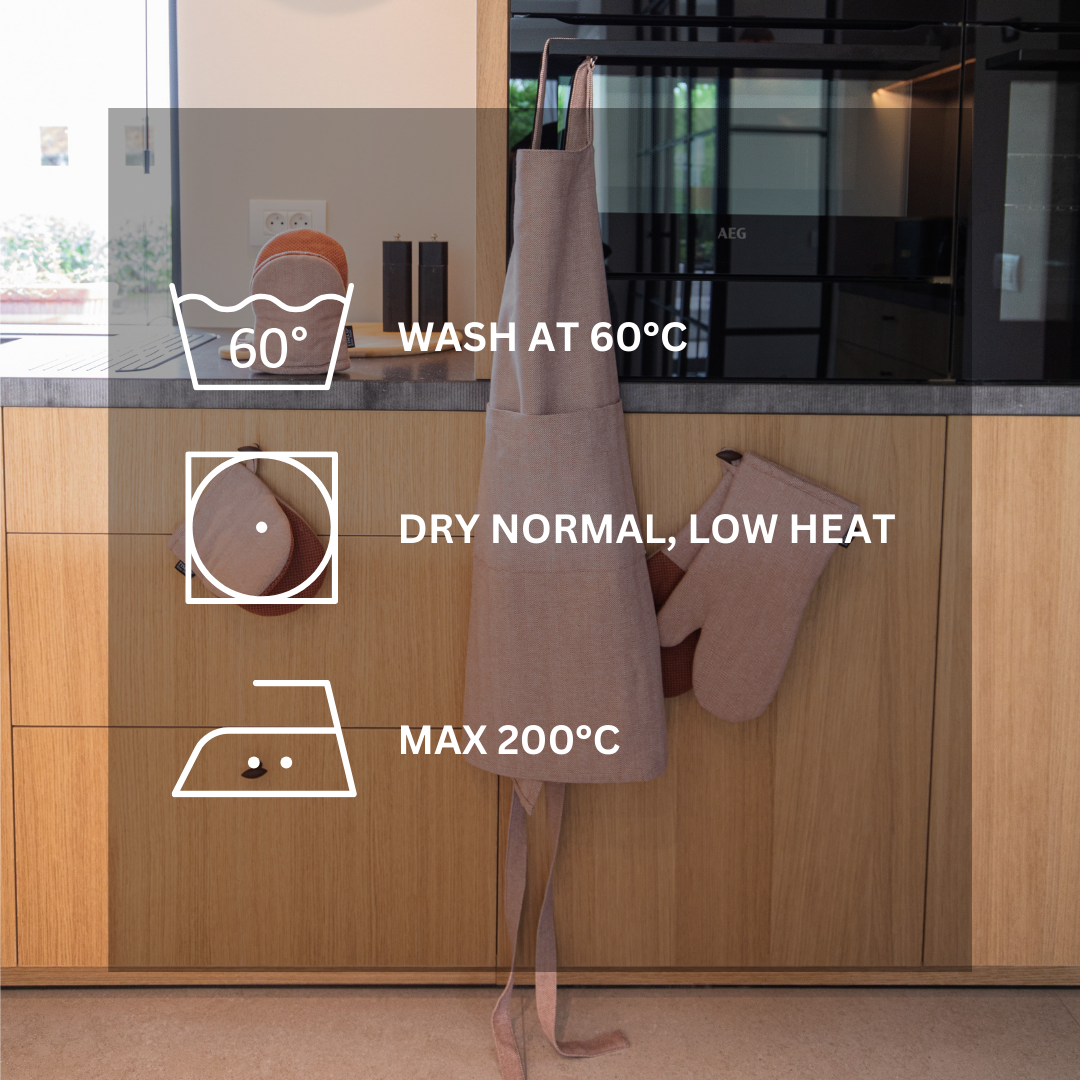 Je kan de keukenschort combineren met eventueel de bijpassende keukenhanddoeken en grippers om je look te vervolledigen.