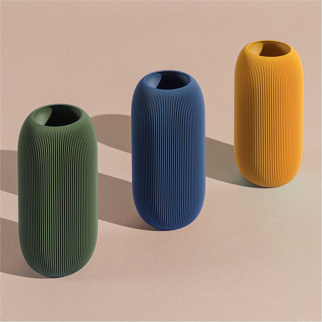Vaas: Gemaakt van polymelkzuur, kortweg PLA, de vaas is een uniek object dat tot leven wordt gebracht door honderden dunne laagjes. Kleine oneffenheden - nauwelijks zichtbaar voor het oog - maken elke vaas uniek.